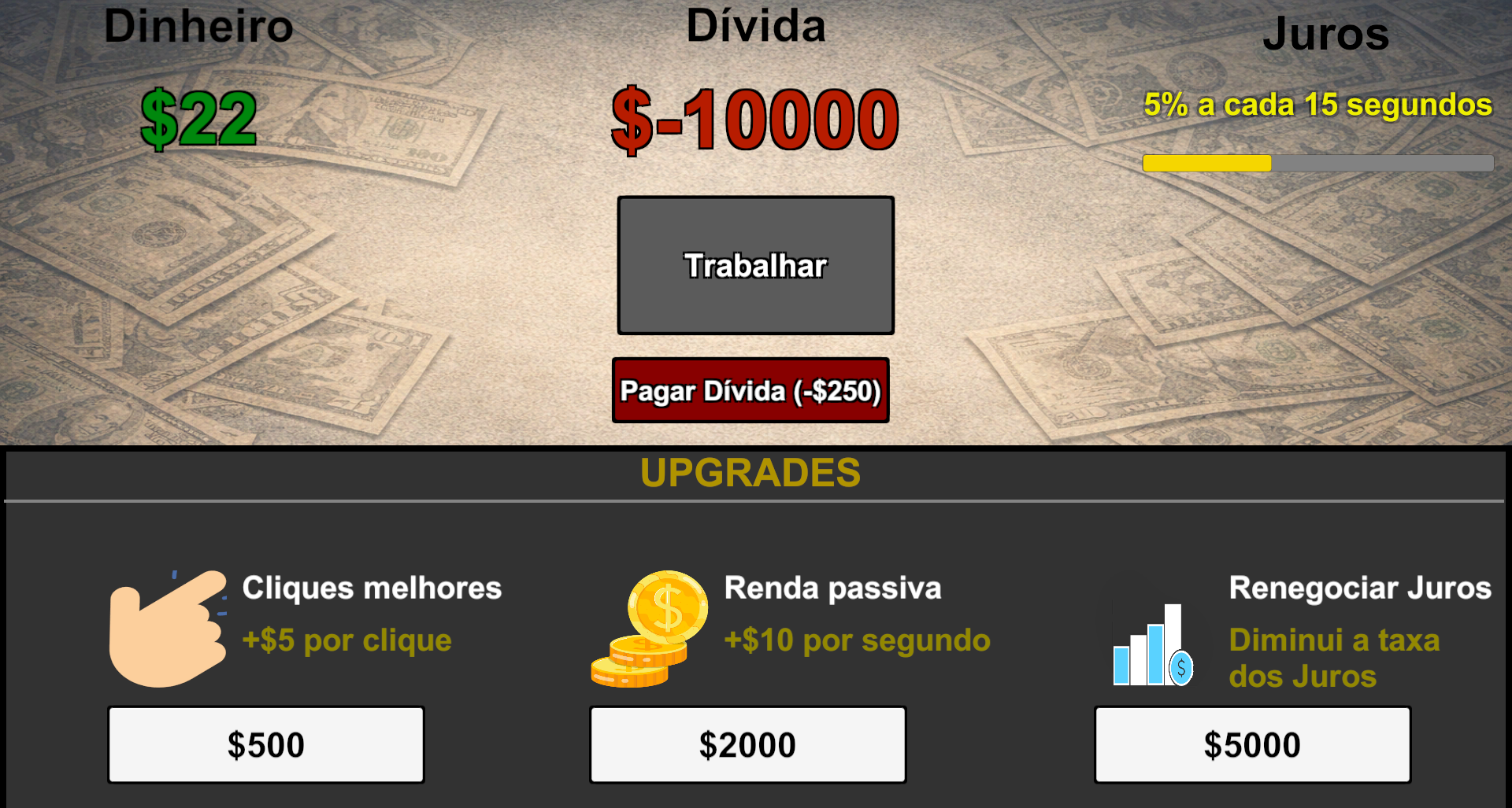 Você começa devendo, ganha dinheiro clicando, investe em upgrades e tenta pagar tudo antes que os juros te engulam.